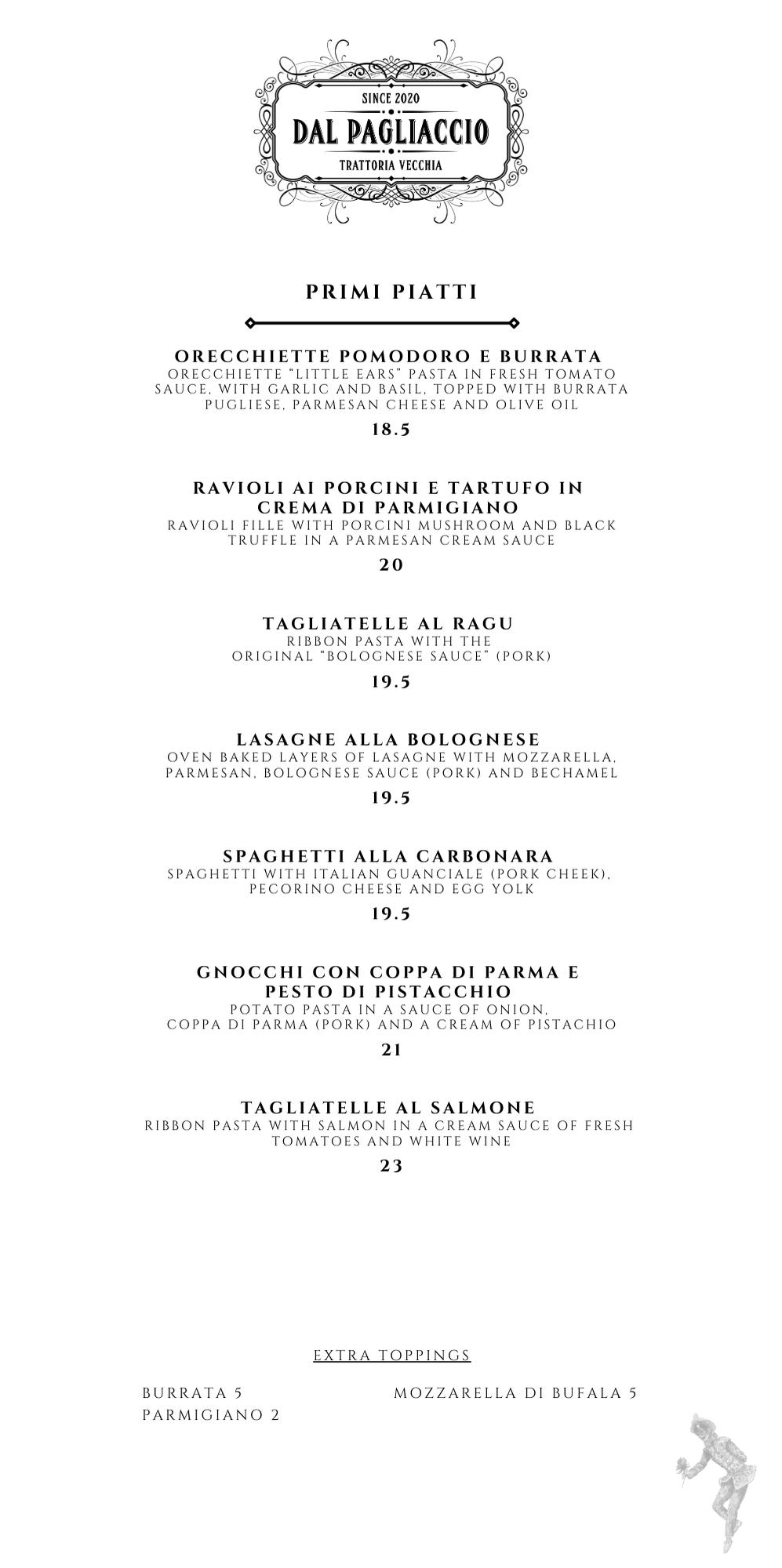 For groups of 7 or more, we offer a shared dining experience with a chef’s selection. This carefully curated group menu includes a variety of antipasti, insalate, pasta, secondi (meat & fish), and of course, delicious desserts! Our menu is designed to showcase the very best of authentic Italian cuisine – from our homemade pasta to our regional specialties.